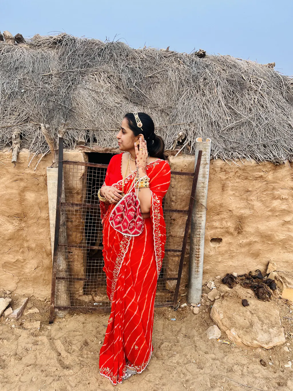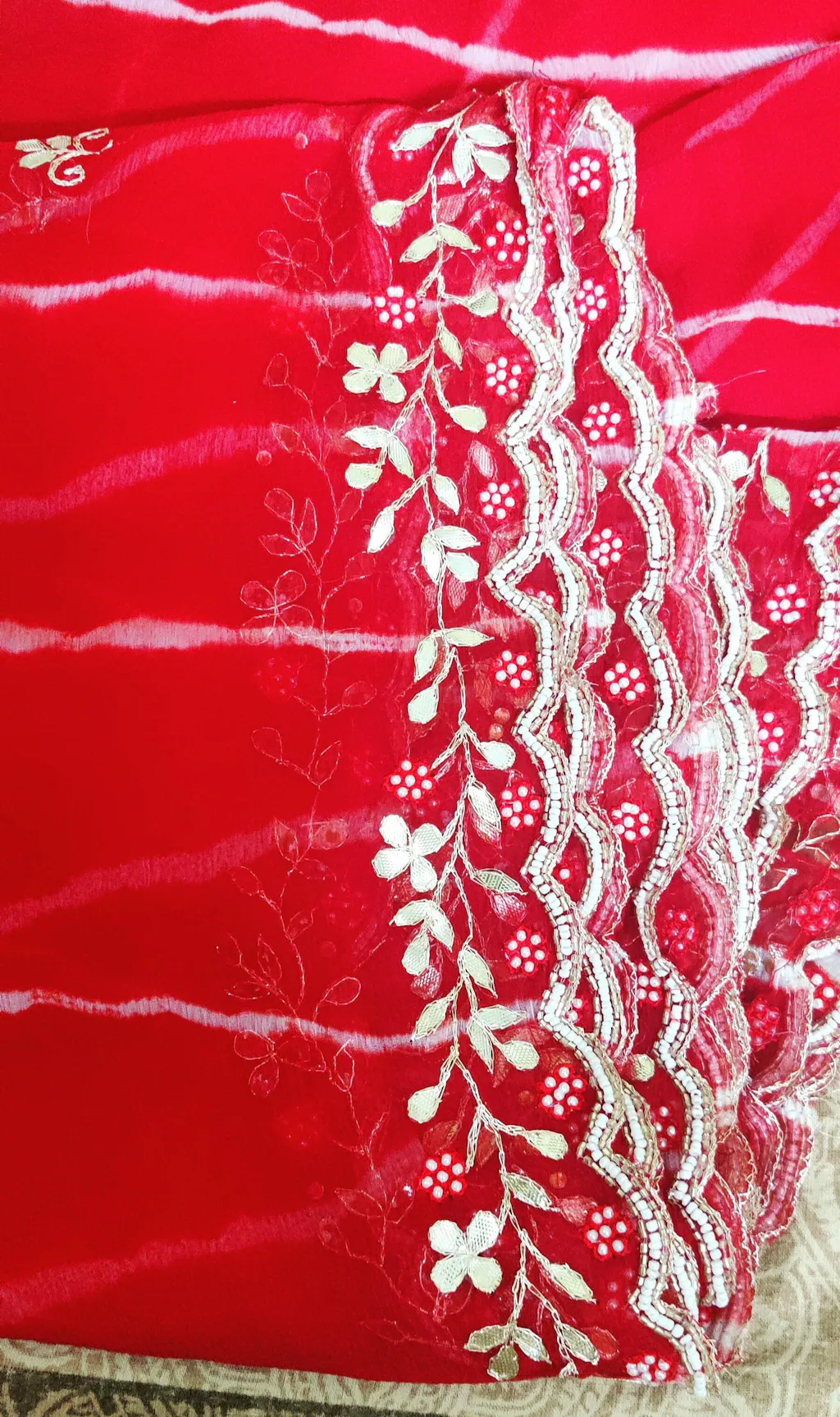 Diamond chiffon hand dyed leheriya saree enhanced with with a beautiful scalloped border detailed with hand embroidered Gotapatti, cut daana and pearls. It comes with a plain red Italian crepe blouse piece with light work on sleeves with light work on sleeves.