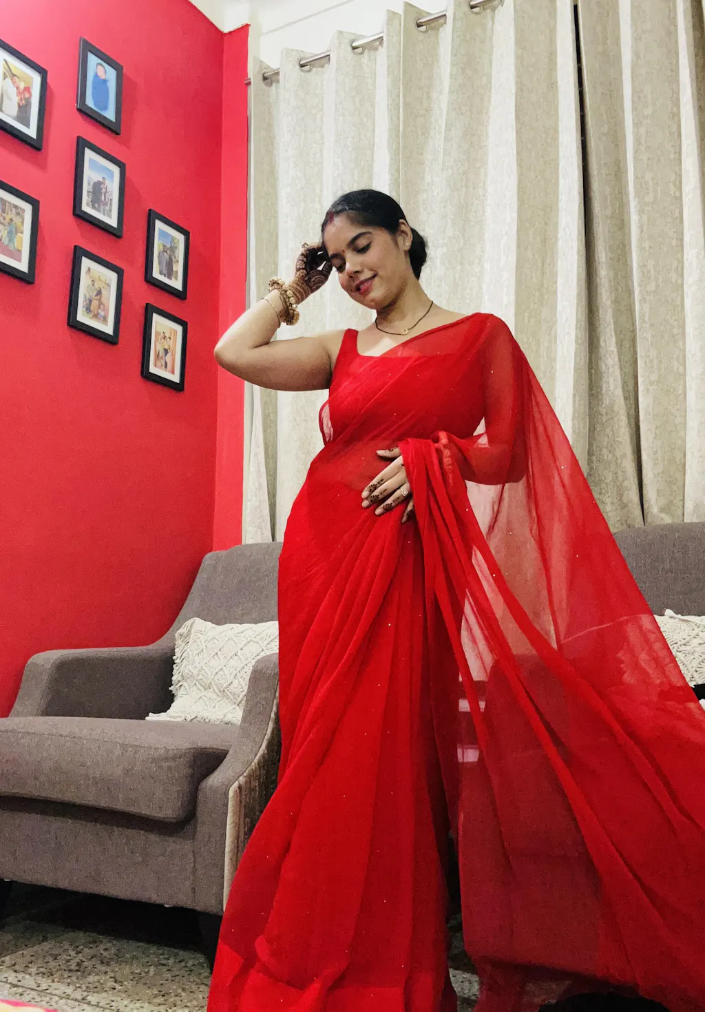 A classic diamond chiffon scarlet red mukaish saree never fails to impress. Versatile, elegant and so classy! It comes with a running blouse piece in Italian Crepe.