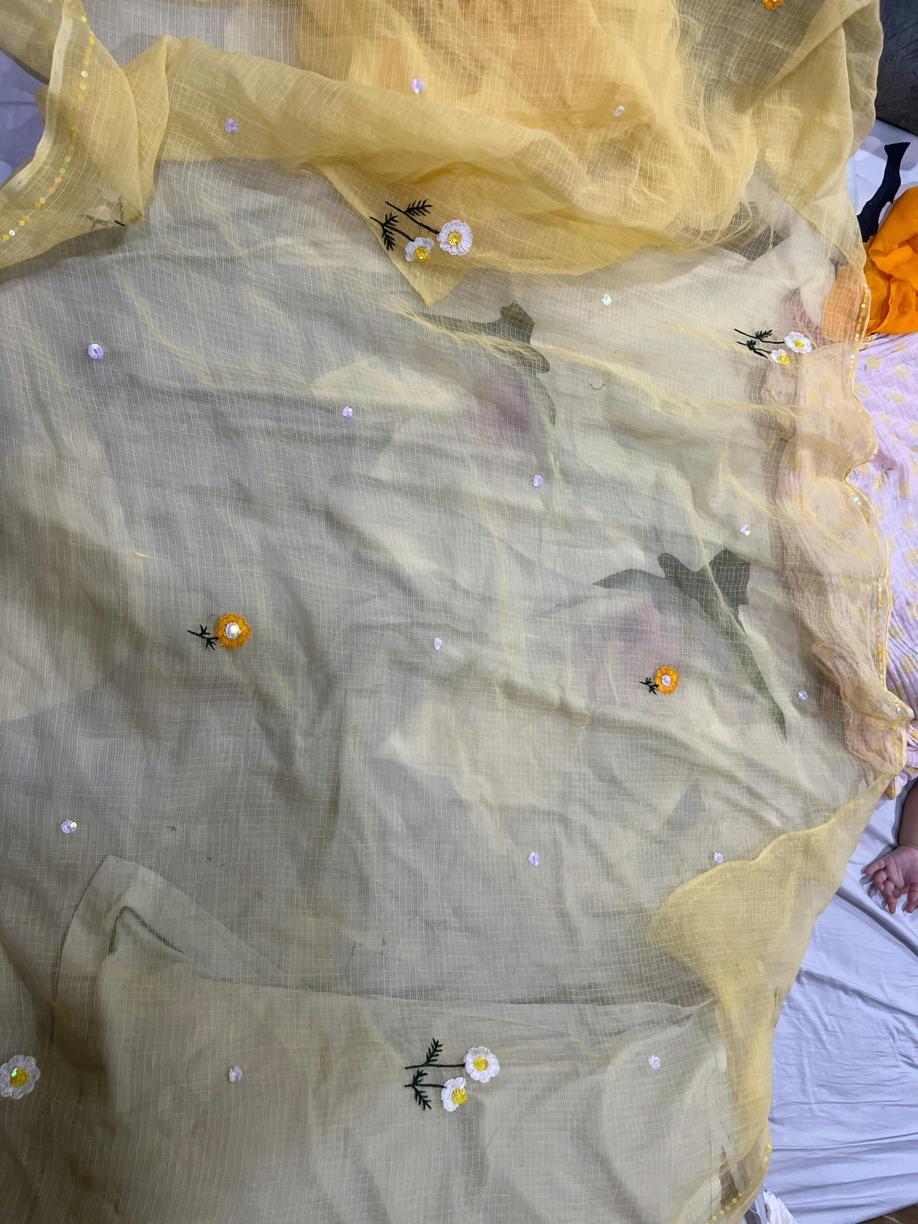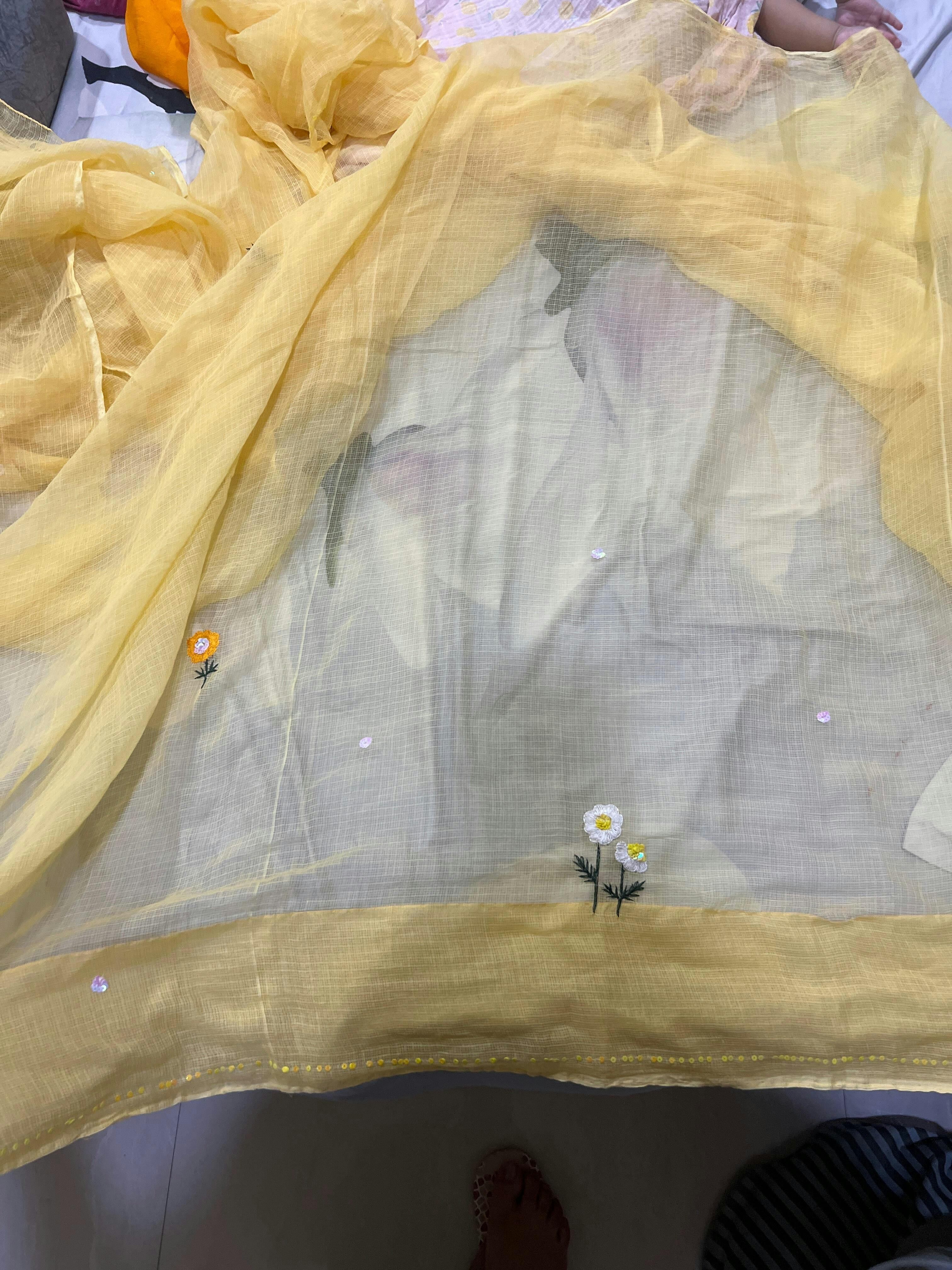 Bask in the golden glow of tradition with this ethereal Kota Doriya Saree on a buttery yellow base, delicately hand embroidered with blooming Resham flowers.The saree comes with a contrast blouse piece in Italian crepe, with light work on sleeves.