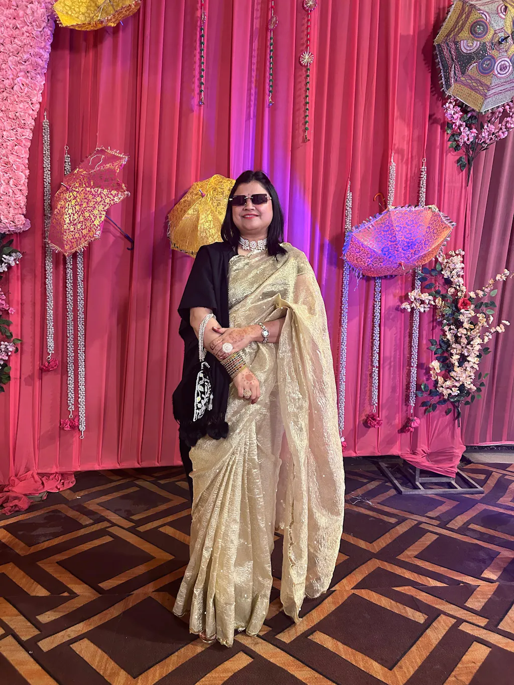 Golden crushed Tissue Saree with hand embroidered sequin scalloped border and delicate pearl sprinkles. It comes with a contrast black blouse piece in Italian crepe with sequin hand embroidered buties on the front body.